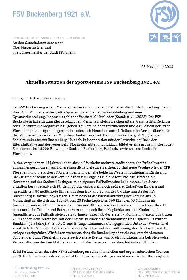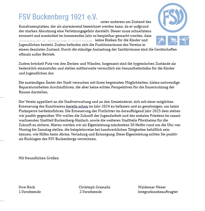 Aktuelle Situation des Sportvereins FSV Buckenberg 1921 e.V.