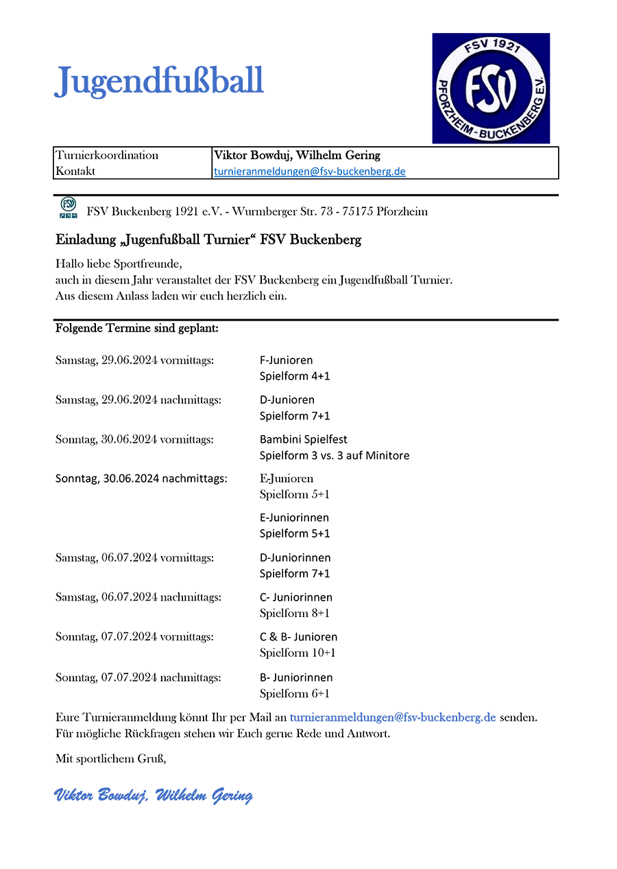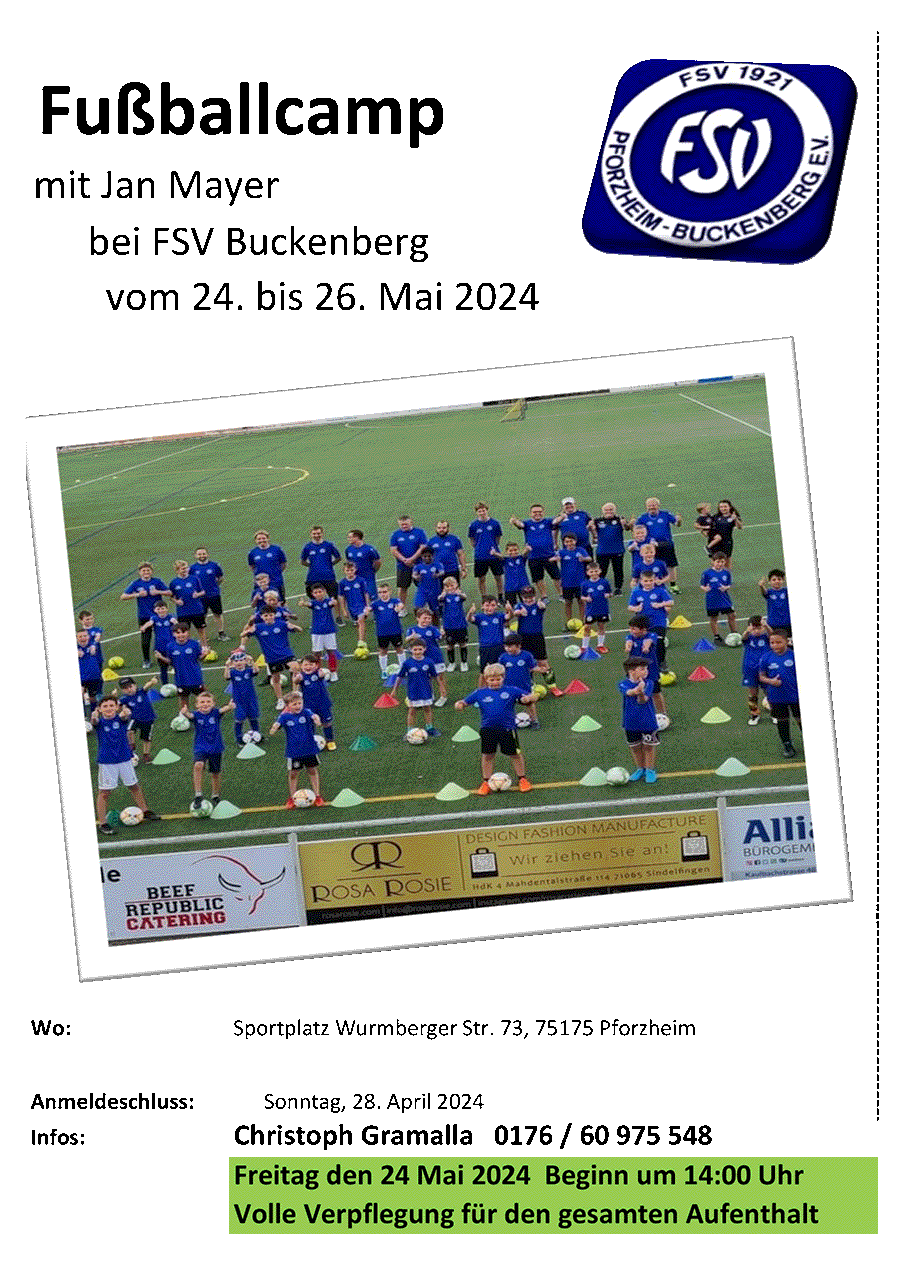 Auch in diesem Jahr veranstaltet der FSV Buckenberg wieder ein Junioren- und Juniorinnen-Turnier im Sommer 2024. Außerdem findet Ende Mai wieder ein Fußball-Camp mit Jan Mayer statt.